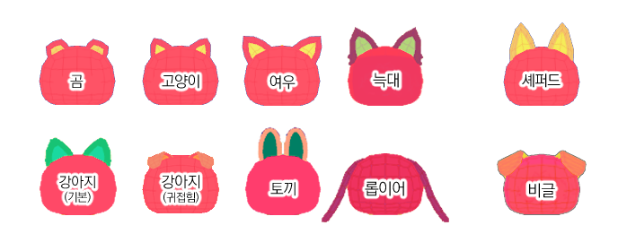 | 신청 가능 동물 | 곰, 고양이, 강아지(기본ㆍ접힌귀), 토끼(기본ㆍ롭이어), 여우, 늑대 | |